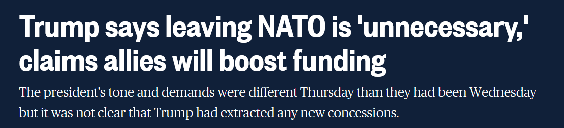 不過,對特朗普口中的“成績”,法國總統馬克龍並不認同,他説,週三各國達成的協議只是確認到2024年將國防開支升至GDP的2%。