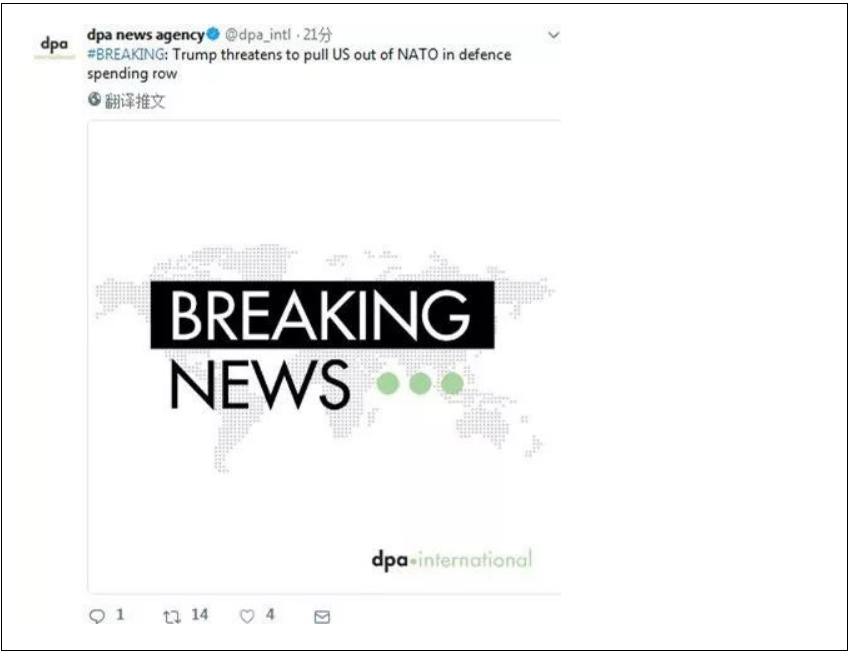 特朗普表示,他的施壓有望令北約軍費開支增加400億美元。CNBC報道,在這番言論後,特朗普接着説,如果這一決定沒有得到國會批准,那麼他將讓美國將退出北約組織。“但當大家都願意提高國防開支,這樣做就沒有必要了”。