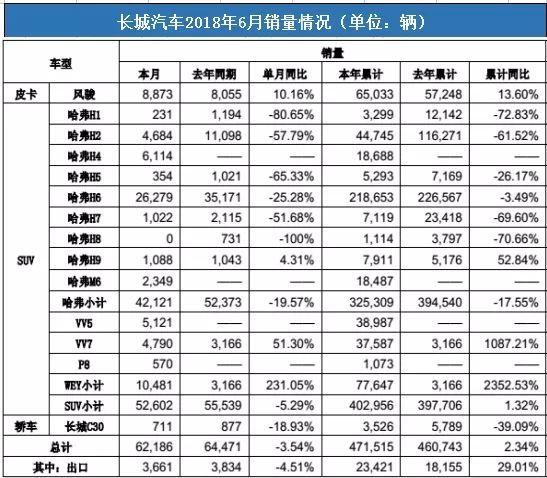 和吉利的全線飄紅的成績不同,長城的日子最近並不好過,隨着SUV增幅的逐漸降低,主要靠SUV支撐的長城出現了疲軟,雖然2018年上半年,長城汽車共計銷售471515輛,同比增長2.34%,全年銷量目標完成四成左右,但是哈弗品牌卻是全線的下跌。