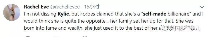 “大家到底是怎麼把Kylie歸為‘self-made’一類人中的??本身就是個富二代,不用苦苦為任何事情還有金錢掙扎!我覺得這完全就是對那些敢於放棄一切努力奮鬥為了登上福布斯榜單女性們的不尊重!”