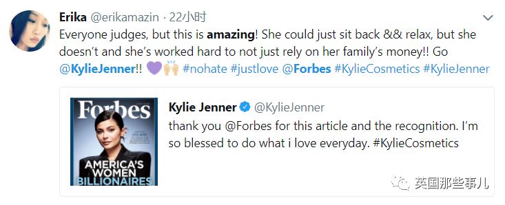 “我很驚訝那麼多人都不願意看見Kylie Jenner登上了福布斯的榜單。沒錯,她是出生在一個很富裕的家庭,其實她完全可以呆在家裏什麼也不做,但她至少努力做了一些事。與其對這件事這麼糾結,不如為自己好好努力變得更好!”
