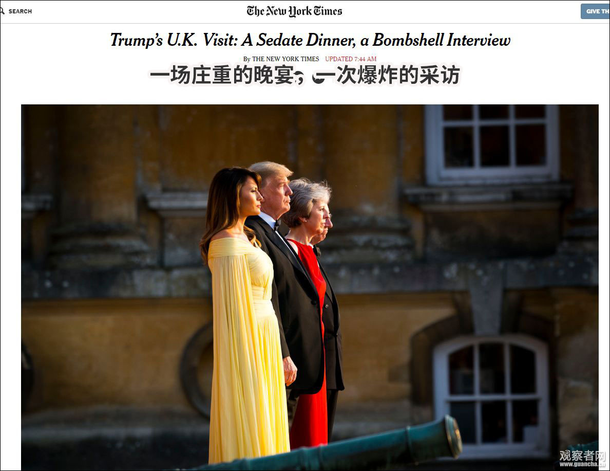 《紐約時報》用了一個形象的標題,概括特朗普的訪英第一天:“一場莊重的晚宴,一次爆炸的採訪。”
