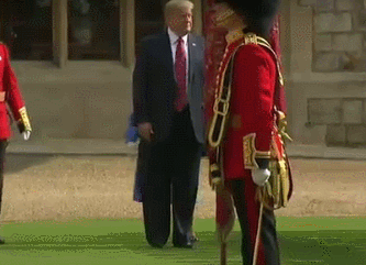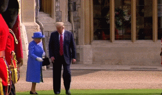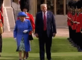 女王開始走在特朗普身後,不知是否為了等女王,特朗普突然停下來,伊麗莎白二世不得不繞着他走。