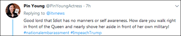 不過,真的見到女王時,特朗普的表現還是讓人失望了。網民掩蓋不住憤怒之情,社交網站上,充斥着對特朗普一邊倒的責備和諷刺: