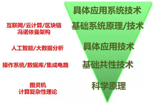 下面,我們來看一下信息技術產業中的不同要素,在從科學到應用的這個鏈條上,各自處於什麼樣的位置。為了不陷入不必要的細節而又能揭示本質,我們將這個鏈條分為五個環節:科學原理,基礎共性技術,具體應用技術,基礎系統原理/技術及具體應用系統,見圖1。