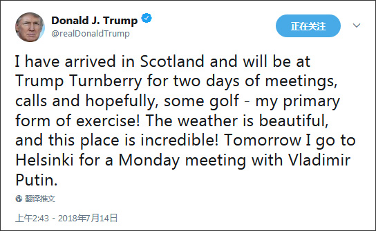 “我已經到蘇格蘭了,我會在特朗普•坦貝利度假酒店待兩天,開開會、打打電話,而且很有希望能打打高爾夫——我的主要運動形式!天氣真好,這地方真棒!明天我就去赫爾辛基,週一要跟普京見面。”