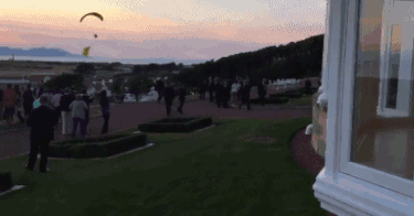 據《每日郵報》報道,這名抗議者突破了蘇格蘭警方花費超過500萬英鎊所構築的安全防線,用滑翔設備帶着寫有“特朗普:沒水準”的黃色的條幅在坦貝利度假酒店上空飛一圈又一圈。