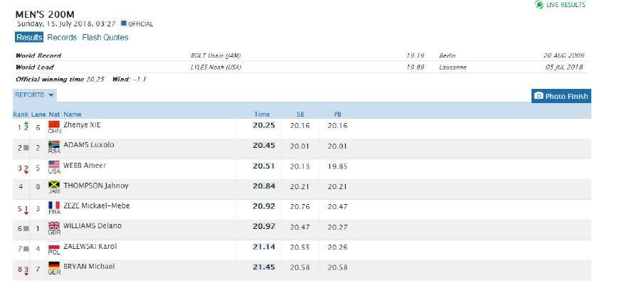 能在關鍵大賽中戰勝美國名將,這對謝震業來説具有很深遠的意義。而且本場比賽風速是逆風1.1米/秒,如果謝震業能儘快打開20秒大關,他在200米項目上的自信心還將進一步提升。謝震業今年已連續跑出20秒16、20秒25的驚人成績,下月的雅加達亞運會他是男子200米項目最大的爭冠熱門。