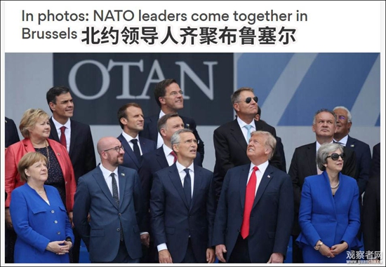 7月11日,在比利時布魯塞爾參加北約峯會的特朗普,與“盟友”們“仰望天空”