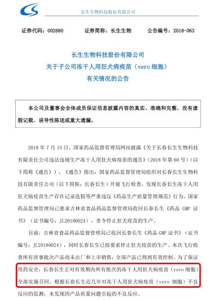 7月16日早間,長生生物發佈公告證實了長春長生對有效期內所有批次的凍幹人用狂犬病疫苗全部實施召回。