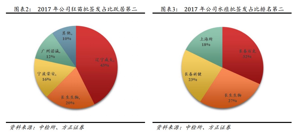 方正證券在2018年4月7日的研報中對長生生物做出”強烈推薦“,認為其核心產品市場佔有率靠前並呈逐步提升趨勢, 以 2017年批簽發數據為例,公司狂苗全國佔比 19.70%躍居第二(2016 年排名第四),在河南、四川、江蘇、廣東等地公司市佔率第一;水痘疫苗全國佔比 27%排名第二,在河南、山東、廣東、四川等地銷量第一。
