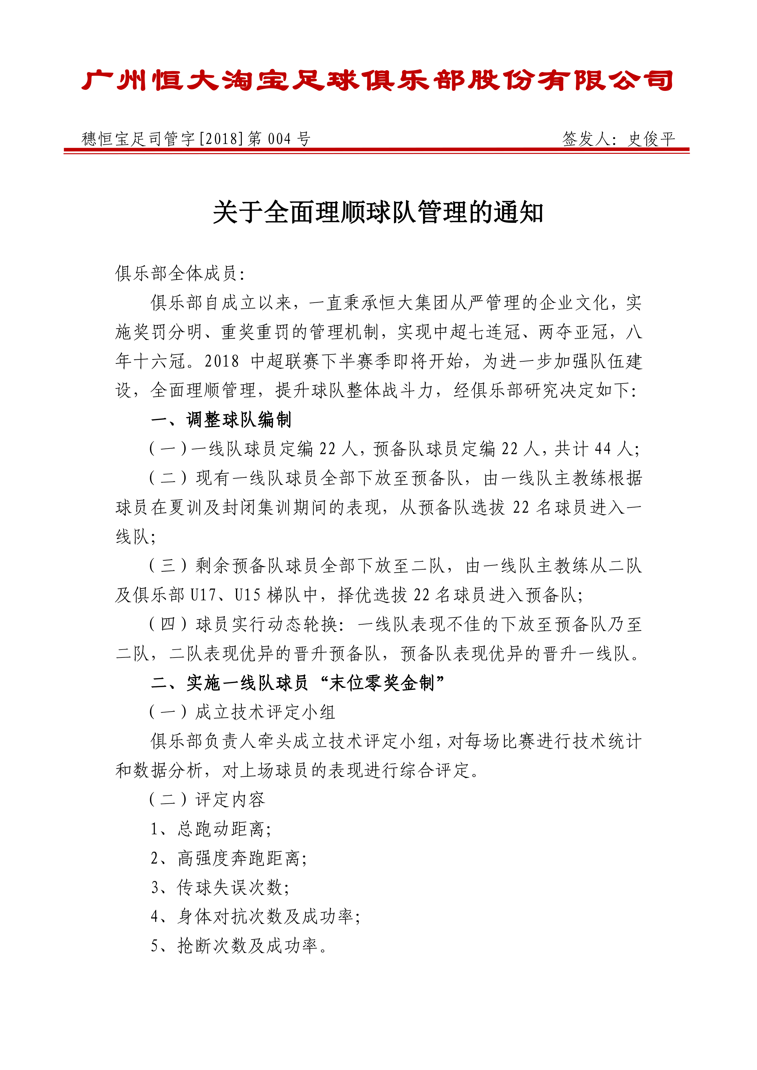 **二是進一步從嚴管理,實施一線隊球員“末位零獎金制”。**由俱樂部負責人牽頭成立技術評定小組,對每場比賽進行技術統計和數據分析,按照上場球員的總跑動距離、高強度奔跑距離、傳球失誤次數、身體對抗次數及成功率、搶斷次數及成功率等5項核心指標,進行綜合評定。“對每場比賽綜合評定排名末位的球員進行‘零獎金’處罰,即獲勝場次取消當場獎金分配資格,平局或輸球場次從以後的比賽獎金中予以同等扣罰;對連續兩場排名末位的球員,給予停賽一場並下放至預備隊的處罰;個別場次中,如技術評定小組一致認為球隊整體表現非常優異,則免除本場末位處罰。”