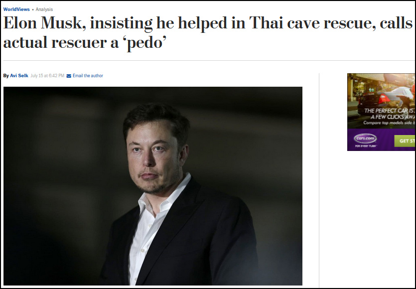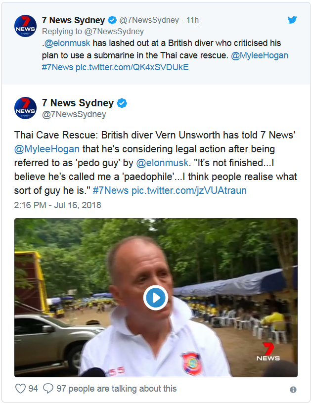 被困的泰國少年獲救已近一週,Space X創始人埃隆·馬斯克和關鍵救援人員維諾·昂斯沃斯(Vern Unsworth)卻因“爭功”彼此指責。昂斯沃斯宣稱馬斯克蹭熱點——“潛艇就是公關噱頭”,馬斯克毫不留情,回敬“戀童癖”稱號。對於惡毒的咒罵,昂斯沃斯表示不排除對馬斯克使用法律手段。