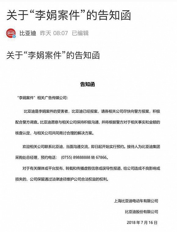 比亞迪公司分別於6月13日、7月4日、7月12日和7月16日連發四則聲明,與“李娟”及其開展的業務撇開關係。