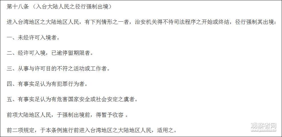 5、“辦法”刪除“小三通”強制出境條文,迴歸使用《兩岸人民關係條例》(《台灣地區與大陸地區人民關係條例》的簡稱)第18條規定。