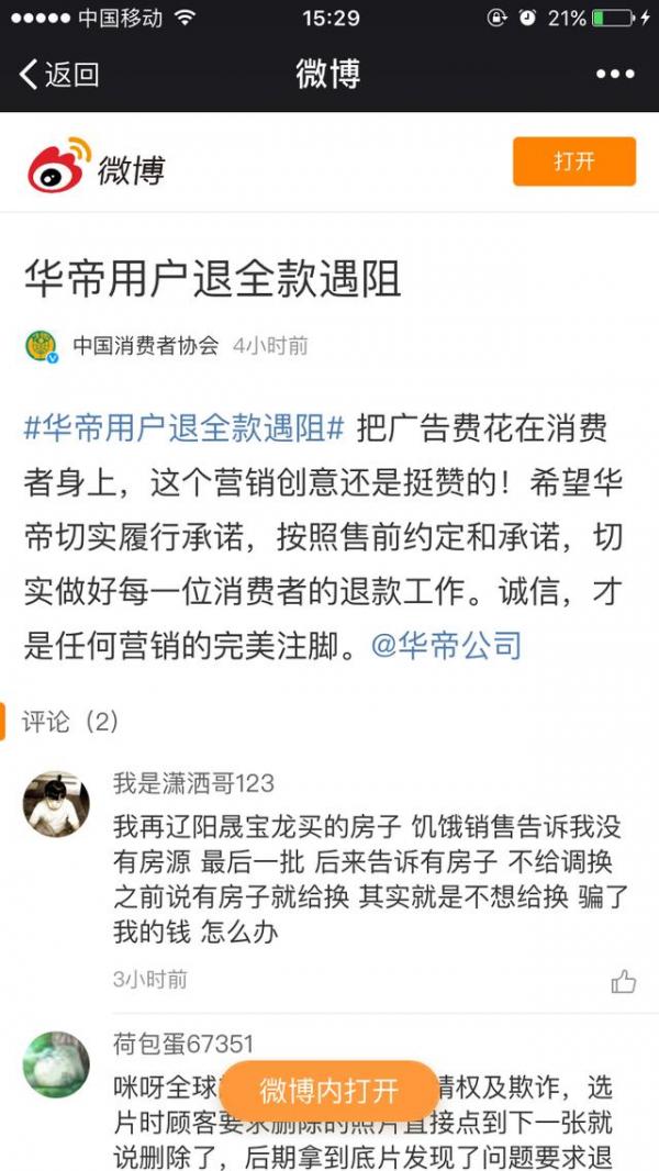 近期,關於法國隊奪冠華帝退全款的消息引發關注,此後有消費者爆出華帝未按照約定退款,今天(7月18日)中國消費者協會官方發佈微博,回應華帝用户退全款遇阻:把廣告費花在消費者身上,這個營銷創意還是挺讚的!希望華帝切實履行承諾,按照售前約定和承諾,切實做好每一位消費者的退款工作。誠信,才是任何營銷的完美註腳。
