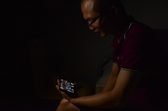 林大強在宿舍通過手機直播看世界盃比賽。攝影:翟星理