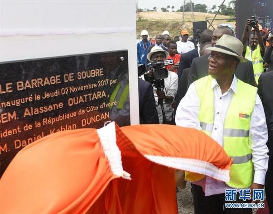 2017年11月2日,科特迪瓦總統瓦塔拉出席蘇佈雷水電站竣工典禮。圖片來源:新華社