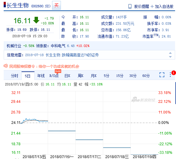 受此利空消息影響,長生生物自本週一(16日)起接連四天開盤一字跌停。