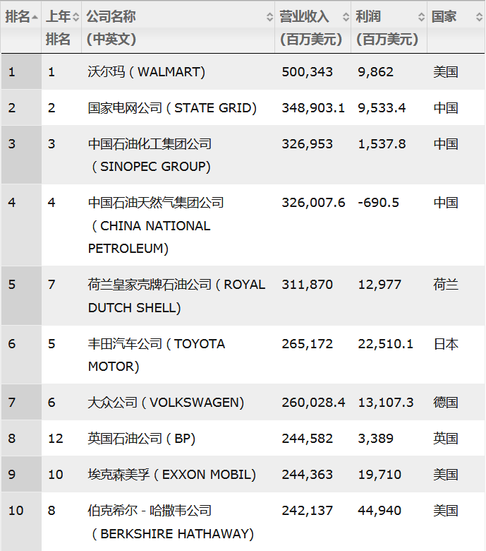 沃爾瑪連續第五年成為全球最大公司,它和三家中國企業——國家電網、中石化和中石油繼續分列榜單前四位,位次沒有變化。利潤榜前10位的四家中國公司仍然是工建農中四大銀行。