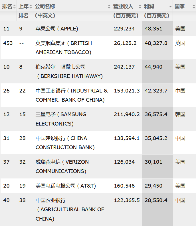 蘋果仍高居利潤榜首位,排在第二位的是今年重新進入世界500強的英美煙草集團,利潤率高達185%。利潤榜前10位的四家中國公司仍然是工建農中四大銀行。