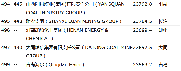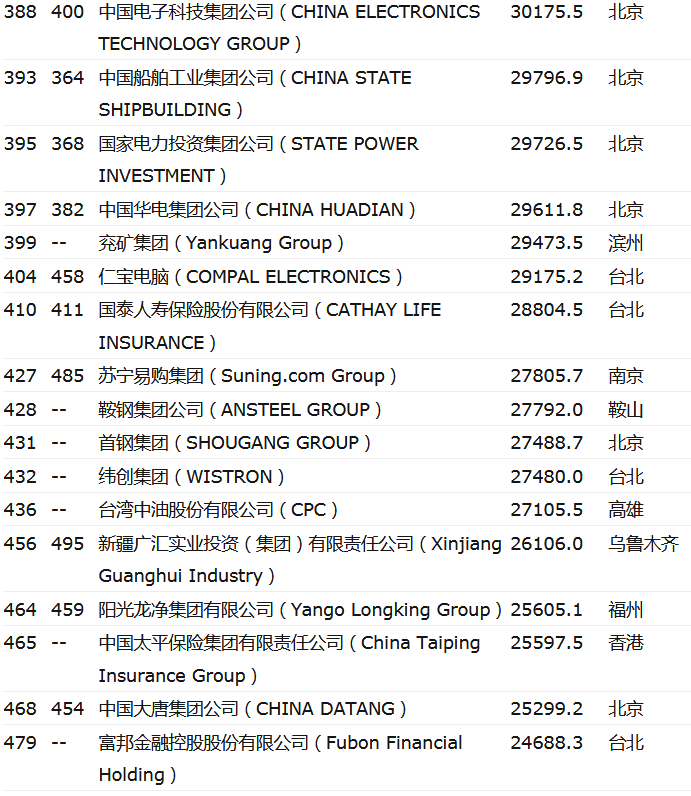 據悉,今年有13家中國公首次上榜,它們是:招商局集團、雪松控股、象嶼集團、兗礦集團、鞍鋼集團、首鋼集團、緯創集團、台灣中油、中國太平保險集團、富邦金融控股、泰康保險集團、河南能源化工集團、青島海爾。新上榜公司最多的行業是保險(3家)。青島海爾則是電子與電子設備行業唯一一家中國新上榜公司。