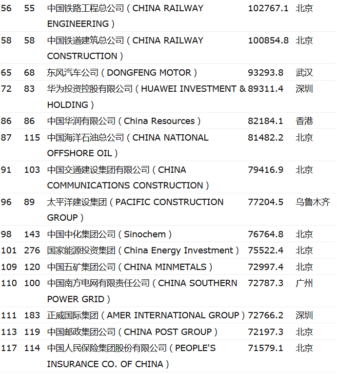 排名躍升最快的前十家公司中有八家都來自中國大陸,除了國家能源投資集團,其餘七家是:阿里巴巴(上升162位)、騰訊(上升147位)、山東能源集團(上升138位)、廈門國貿(上升134位)、美的(上升127位)、廈門建發(上升126位)和碧桂園(上升114位)。