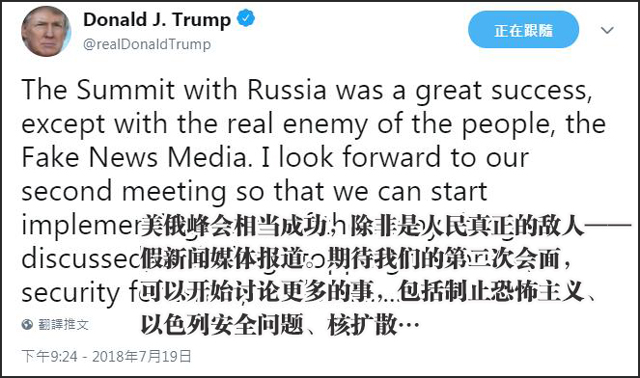 特朗普也在推特上多次表示,他與普京日前舉行的會晤取得巨大成功,除非是假新聞的媒體做報道。