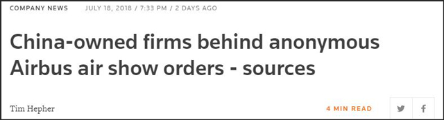 據彭博社、路透社等18日報道,波音和空客兩家公司對於在航展中獲得的354億美元訂單,拒絕公開買家身份。知情人士指出,這些“隱藏訂單”主要來自中國客户。