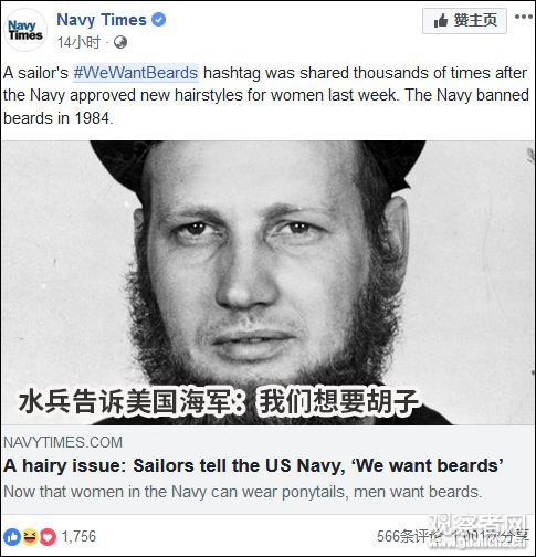 據美聯社當地時間20日報道,由於美國海軍上週開始允許女兵留馬尾,或者其他將頭髮綁起來的髮型,男兵們表示,他們希望鬍子也能被允許。