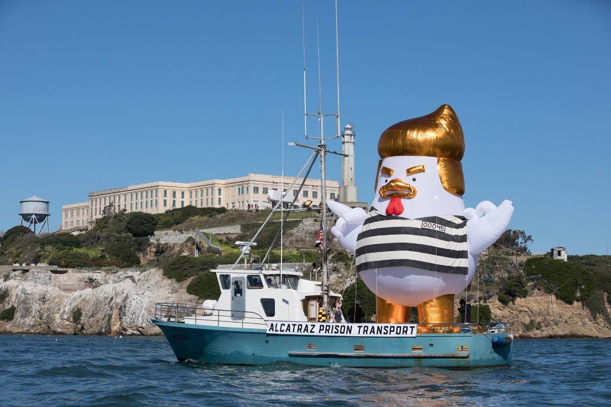 這次的“特朗普雞” 身着的45號黑白條囚服, 週日它將乘坐美國著名監獄“惡魔島監獄”的運輸船經過舊金山海岸。