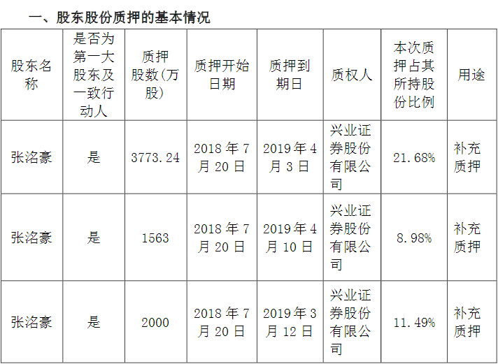公告顯示,張洺豪已累計向興業證券質押股份達16686.24萬股,佔其持股比例95.87%,佔公司股本總額的17.14%。