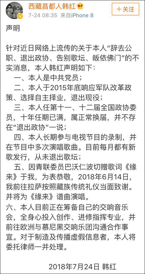 24日上午,韓紅在微博發表聲明,稱自己並未出家,也一併否認“辭去公職、退出政協、告別歌壇、皈依佛門”等不實傳聞。