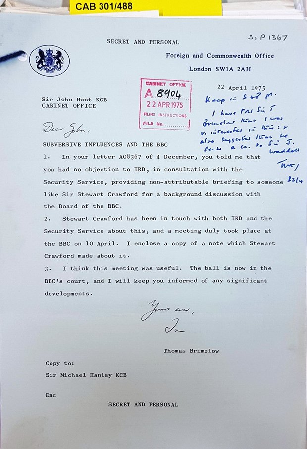 時任IRD局長將此視為與BBC開展合作的機會,他寫道,顛覆活動的主要影響來自媒體,尤其是廣播媒體,“長期以來我們關注對內和對外的安全問題,對公眾生活有潛在影響的機構一直是需要重點關注的目標,BBC當前的做法能夠為這一高度敏感領域的工作提供有意的幫助。”