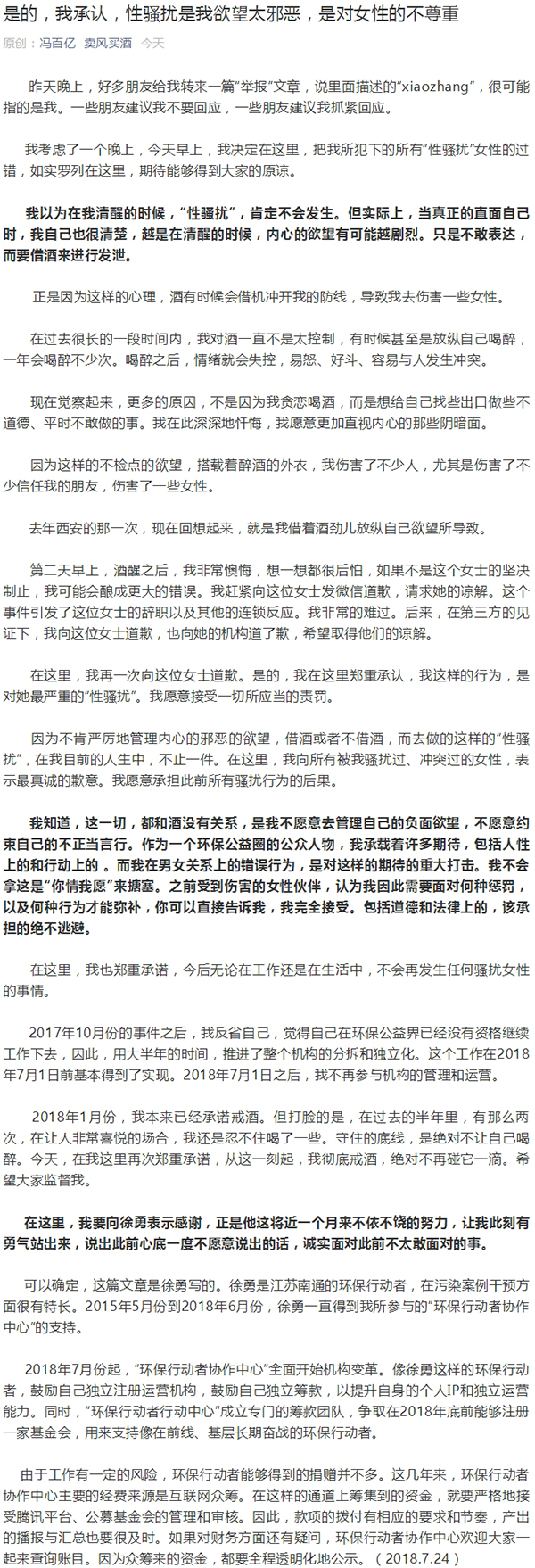 環保公益人馮永鋒回應性騷擾:將徹底戒酒,絕不再犯