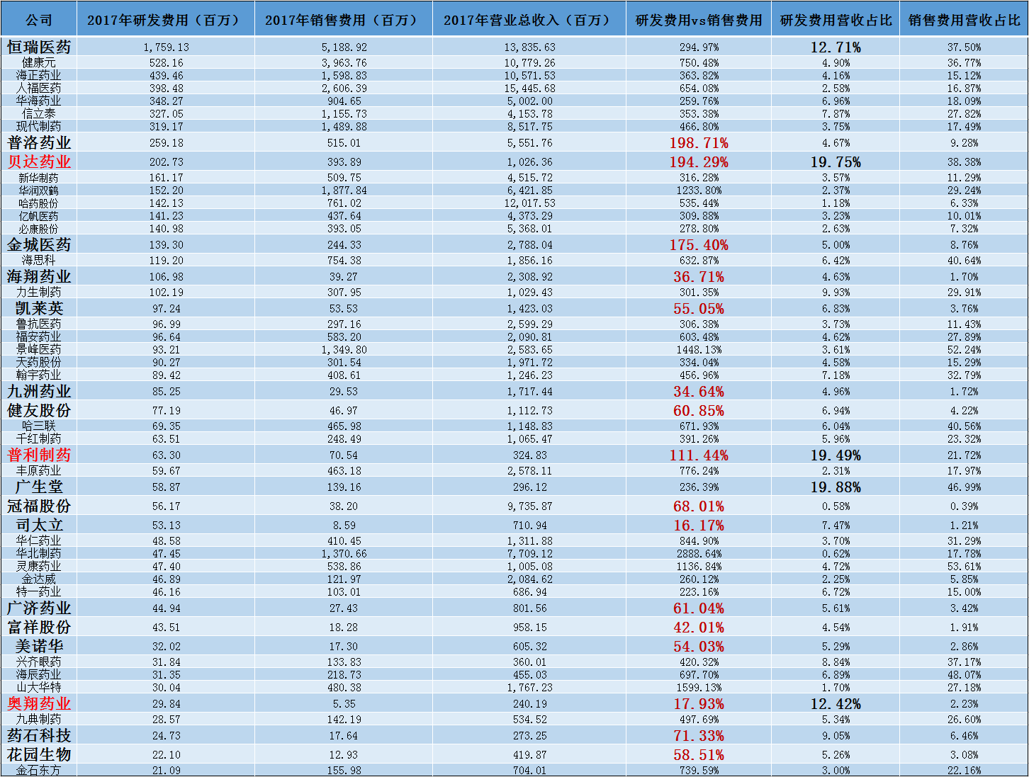 觀察者網在財匯大數據終端上注意到,2017年,恆瑞醫藥領銜的申萬“化學制藥”行業中,研發投入排名前49的企業裏,只有16家銷售費用/研發費用小於200%,而研發投入佔營業總收入超10%的僅為5家。