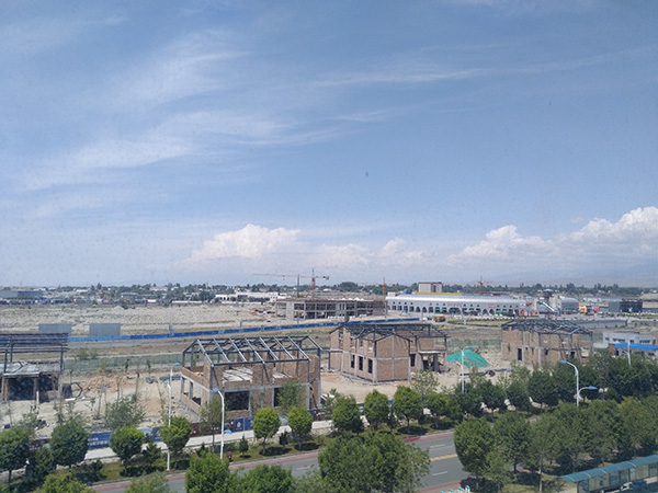 6月中旬,澎湃新聞記者走訪霍爾果斯市區內近二十個工地,大半都停工了。謝芳華和馬濤説,停工也是因為資金問題。