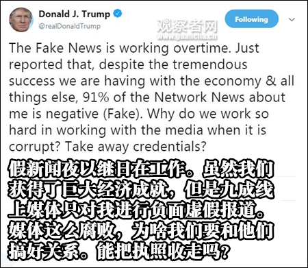 除了CNN之外,美國其他主流媒體如《紐約時報》、《華盛頓郵報》等也是特朗普不時怒懟的對象,甚至曾在推特上發問:“能不能把(新聞媒體)執照給收走?!”