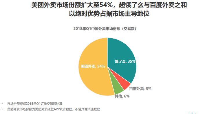 作為外賣業務的先行者,餓了麼已被美團外賣超過。即使在合併百度外賣之後,市場份額也未見明顯提升。Trustdata發佈的報告顯示,2018年第一季度,餓了麼+百度外賣的市場份額為40%,低於美團的54%。