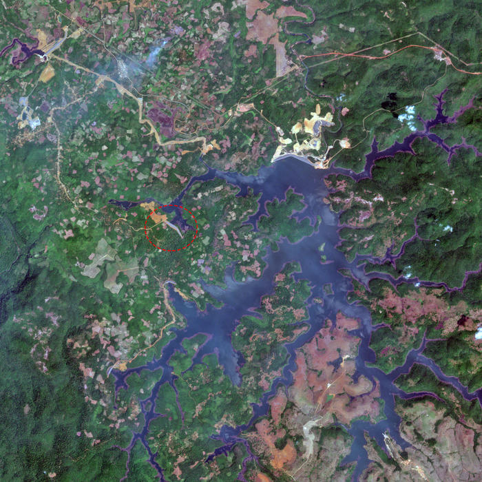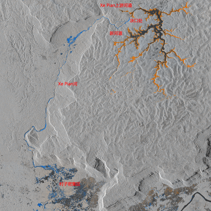 其中藍色部分是雷達回波顯著減少的區域,這裏是陸地變成水面。可以看到從Saddle-Dam D潰決衝出的洪水塑造了一條新河道,匯入Xe Pian河。Xe Pian河道以及兩側有很多藍色區域。上圖左下河道兩側有很多村子,它們都遭到沒頂之災,截止25日水位依然未退。