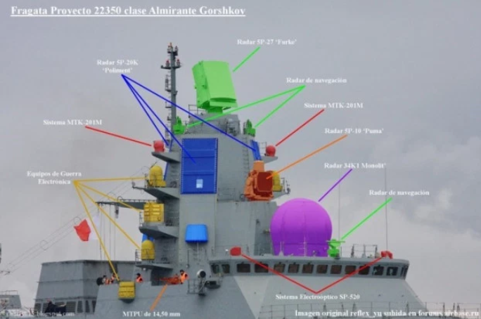 22350型護衞艦是俄羅斯在蘇聯解體後建造的最先進的護衞艦。該級艦標準排水量4550噸,使用柴燃聯合(CODAG)動力,其中2台燃機輪機是烏克蘭曙光-機械設計科研生產聯合體生產M90-F燃氣輪機。航速29.5節,續航力4500海里/14節,自持力30天。