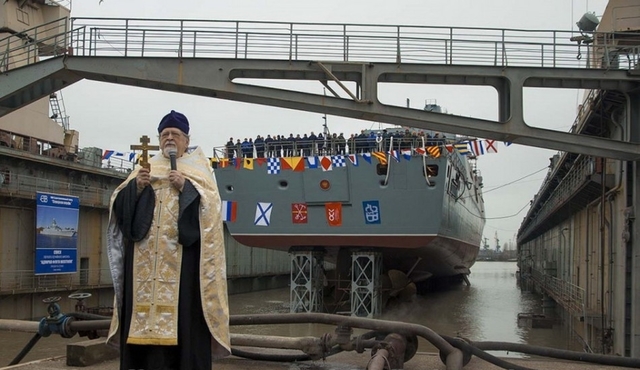 東正教牧師正在給第二艘22350型護衞艦“薩託諾夫海軍上將號”護衞艦祈福 圖源:社交媒體