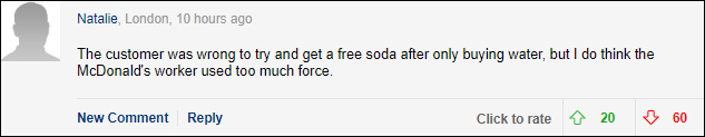 有人則認為:麥當勞員工不該在工作時間、身穿制服毆打顧客;如果顧客真的偷了東西,應該報警。