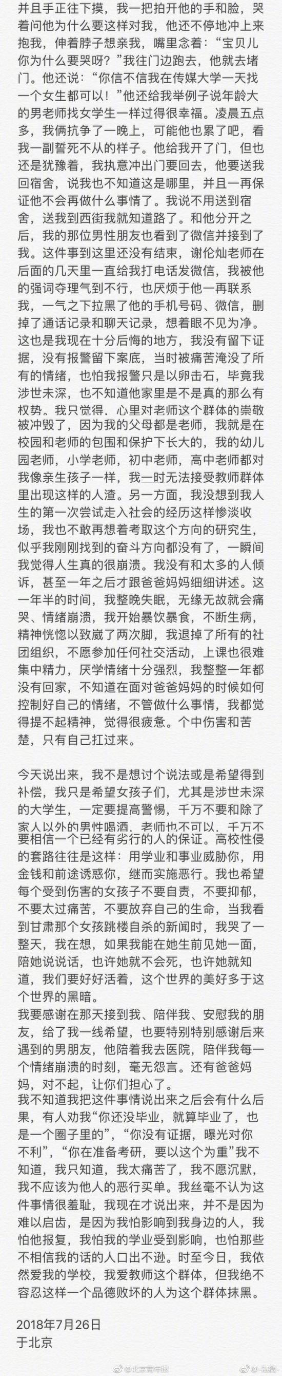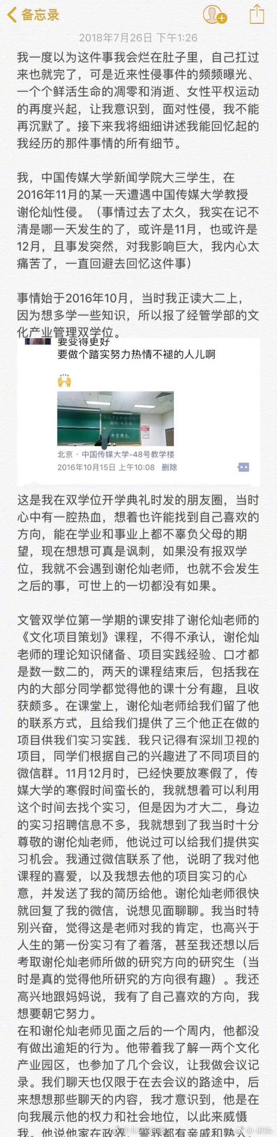 據北京青年報報道,26日,中國傳媒大學大三女生髮文稱,在2016年11月遭受中國傳媒大學教授謝倫燦性騷擾。