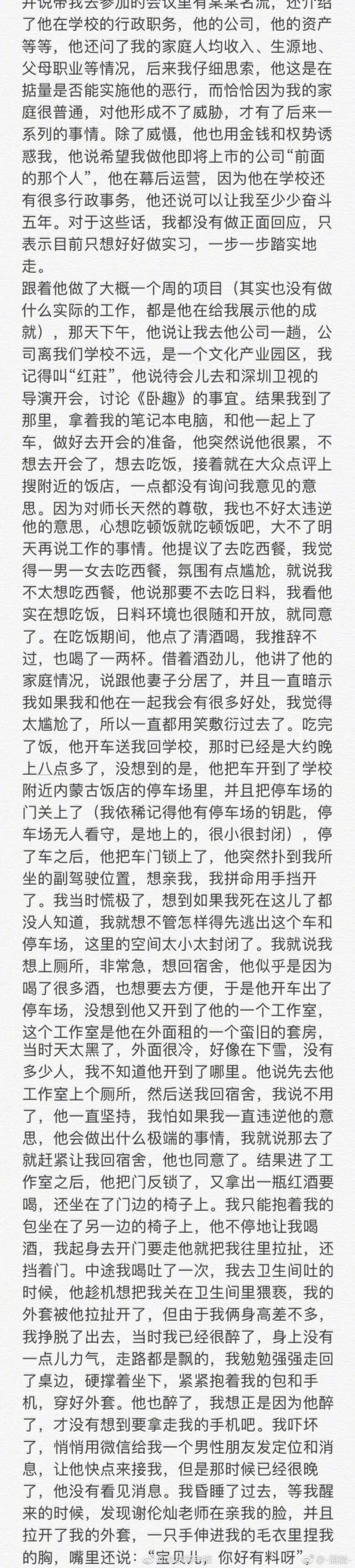 該女生稱,大二時報了經管學部文化產業管理雙學位,上謝倫燦老師的《文化項目策劃》課程。在實習過程中,受到其“金錢和權勢上的誘惑”,暗示如果和他在一起會有很多好處。此後,在一次回學校途中,謝倫燦把車停在停車場,在車內撲向坐在副駕駛位上的該女生,企圖性侵,遭到女生拒絕。隨後,謝倫燦將這位女生帶到工作室,做了拉開女生外套、親臉等一系列行為。該女生進行了一晚的抗爭後,謝倫燦才打開大門放走該生。