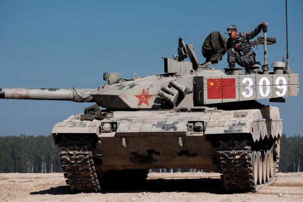 準備參賽的中國96B坦克被塗成了紅、黑、白相間的高對比度迷彩