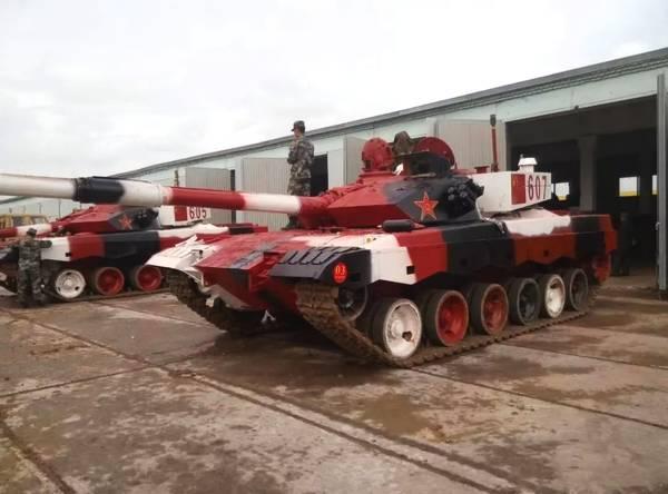 準備參賽的中國96B坦克被塗成了紅、黑、白相間的高對比度迷彩