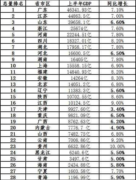 去年同期GDP增速排名中,西藏、重慶、貴州均超過10%,其中重慶為10.5%,今年上半年,重慶GDP為9821.09億,同比增長6.5%。
