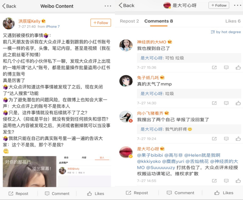 據36氪7月28日消息,從年初開始一直在改版的大眾點評陷入一場侵權糾紛中。近幾日,有小紅書用户發現,大眾點評上冒出了“自己的賬號”和曾在小紅書分享的內容,但自己從未在大眾點評上開通賬號。