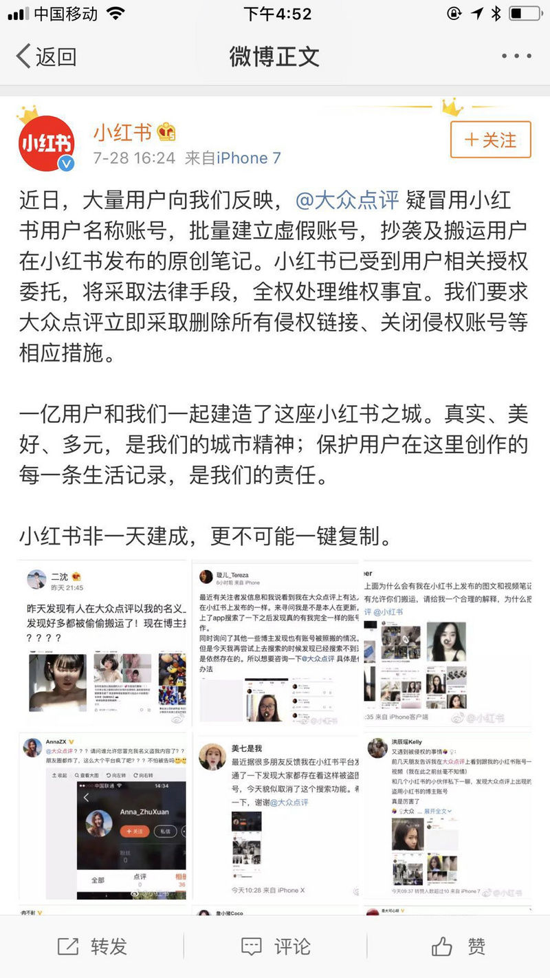 今日,小紅書官微發佈聲明,譴責大眾點評的抄襲行為,“小紅書非一天建成,也不可能被一鍵複製”。